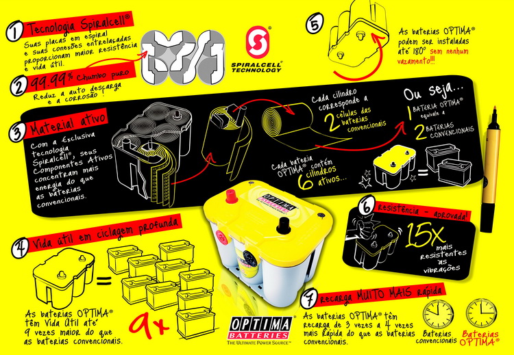As baterias Optima dão um up na energia do seu carro. As Optima RedTop entregam muito mais potência na partida de motores preparados. As Optima YellowTop são o que tem de melhor para quem leva seu som a sério! Nos dois casos, você sai ganhando na qualidade e na vida útil... não tem nem comparação!